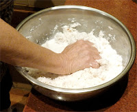 Then all you have to do is pick out the bigger brown shell bits; add some lukewarm water and squeeze away until you get a nice thick milk – actually more like a cream. You drain and reserve that and re-squeeze the coconut with more water until you get the second extraction. A bonus is that your hands get all soft and lovely from the coconut oil.